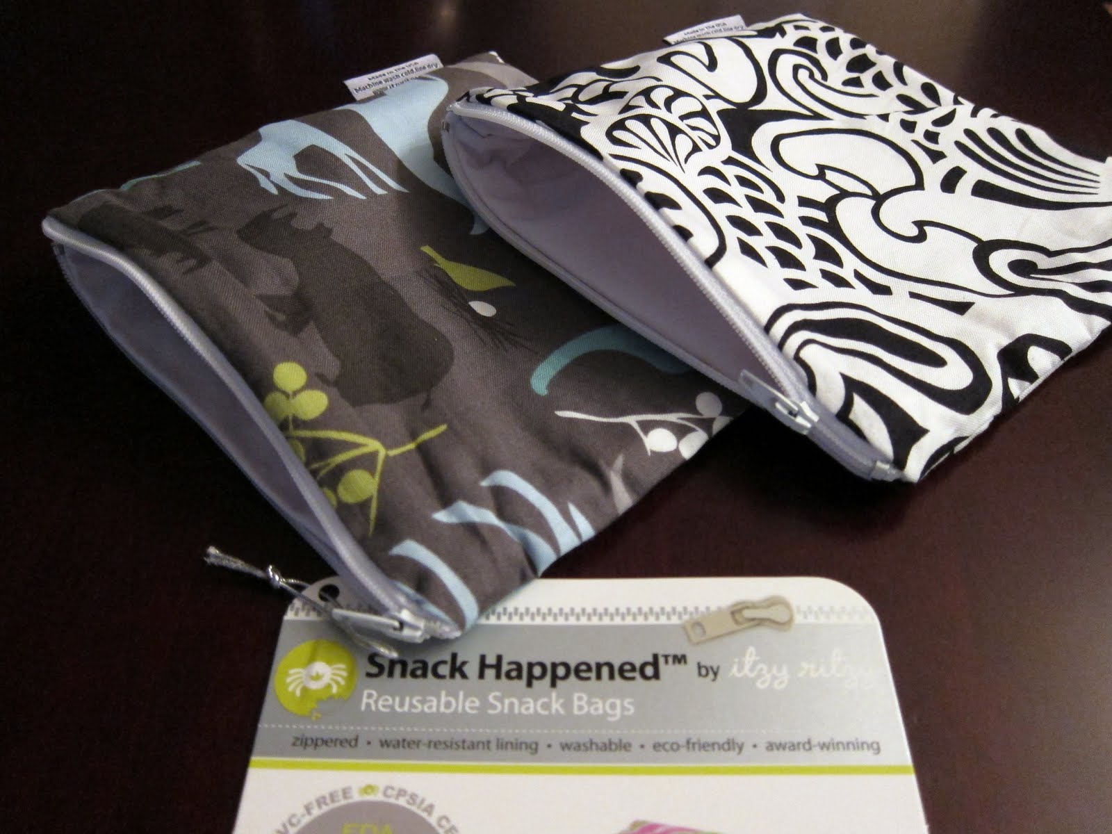 Project Nursery! I absolutely LOVE them! I bought the Urban Jungle Blue for my son and Licorice Swirl for myself. The Snack Happened bags are not only reusable and washable, but they are also FDA approved & BPA Free! The fabric is made from 100% cotton and is lined with thick and lush PVC-Free waterproof lining. The Snack bags are 7" x 7" and are machine washable. They can be used to carry snacks, fruit, sandwiches, cell phone cords, lotions, toiletries...the list goes on and on. Kids and adults can use them!